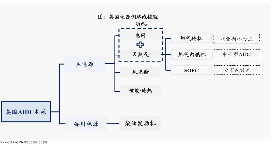 面对电网容量枯竭与极长的接网排期,美国AIDC正在加速向“就地发电/微电网”架构演进。电源侧整体分为主电源与备用电源两条思路: