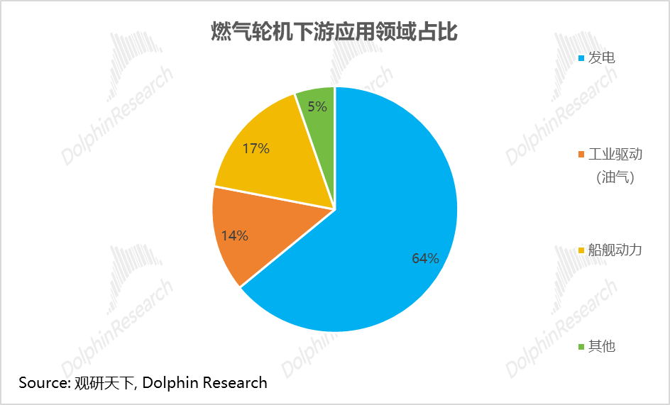 燃气轮机下游应用广泛,主要覆盖发电、工业驱动及舰船动力三大核心领域。其中,发电是绝对主导,贡献了约64%的市场需求。