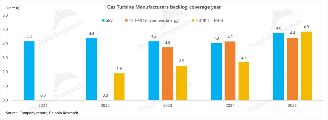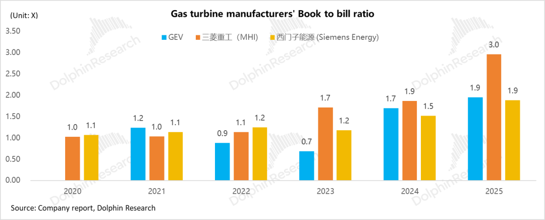 自2024年起,三大巨头新签订单量均创下多年乃至历史新高。2025财年,西门子能源、GEV、三菱重工的订单出货比普遍已升至2左右,三菱已经达到3年,在手订单持续快速累积。