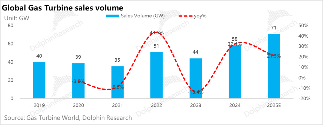 装机规模加速跃升:过去五年(2019-2024),全球燃气轮机新增规模从40GW稳步增长至58.4GW,复合年增长率(CAGR)维持在稳健的8%。但受下游算力激增催化,预计2025年全球新增规模将飙升至70.84GW,同比增速高达21%,行业景气度正陡峭向上。