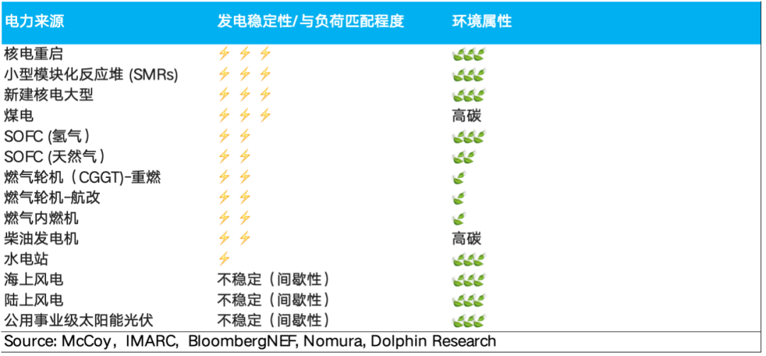 而就地发电的方式主要包括:①燃气轮机;②燃料电池;③往复式发动机;④光伏;⑤地热能;⑥SMRs(小型模块化反应堆)等,基于上述原则,海豚君对主流就地发电技术路径进行筛选: