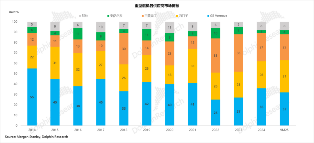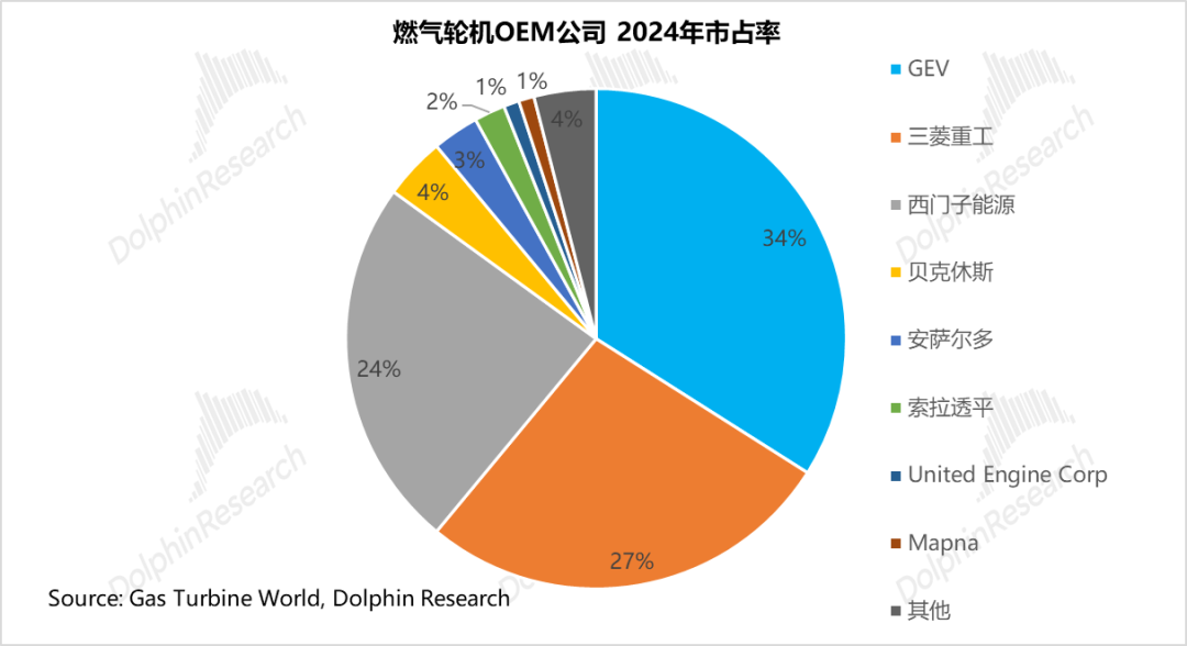 当前,全球重型燃气轮机市场呈现出极其稳固的寡头垄断格局。2024年,GE Vernova(GEV)、西门子能源与三菱重工三大主机厂合计揽获全球约85%的订单份额,在重型燃机领域的市占率更是高达约90%。
