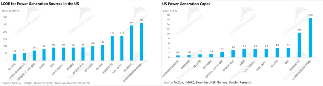 SOFC(天然气燃料电池):LCOE约90美元/MWh。优势在于部署极快(最快90天内点亮)、转换效率高、碳排放低;劣势在于初始投资较高(ITC补贴后约3.5美元/W)及处于商业化初期。