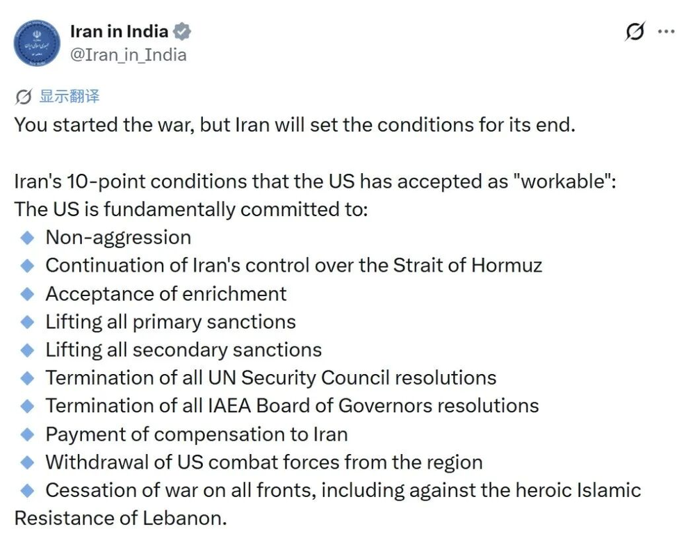 但我并不认为伊朗提出的那十点方案能够最终与美国达成协议。加之特朗普的立场本身就极不稳定、反复无常。所以,无论是直接还是间接同美国谈判,或者只是在双方之间来回传话的人,都缺乏足够的可信度。