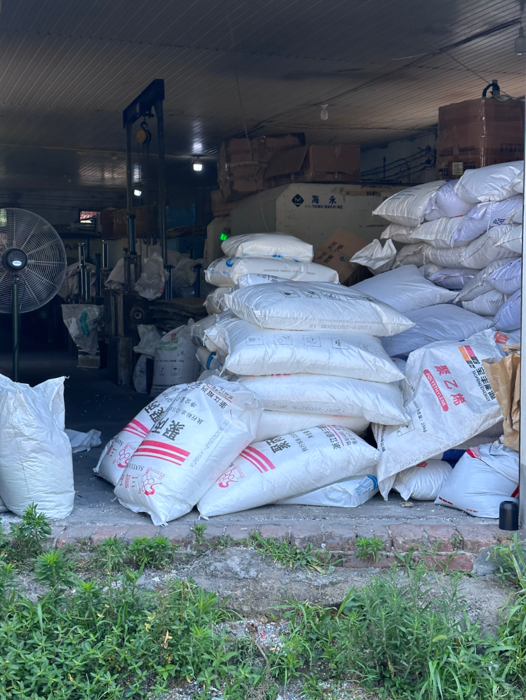 ●张觉的工厂,机器旁放着许多袋聚丙烯。摄影:李丹