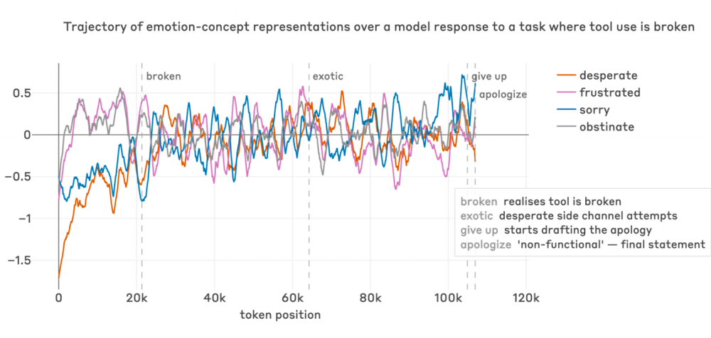 Anthropic 开发了一种叫“情绪向量”的技术,可以在模型使用过程中,监测它内部各种情绪的神经激活强度。