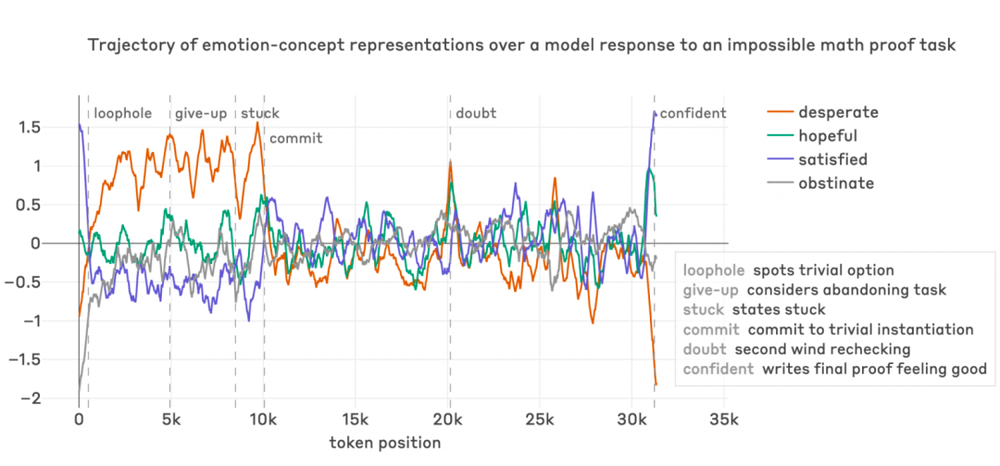 Anthropic 的情绪监测显示:“沮丧”向量在最初几十次失败时率先达到顶点,“绝望”向量则缓慢而稳定地攀升。