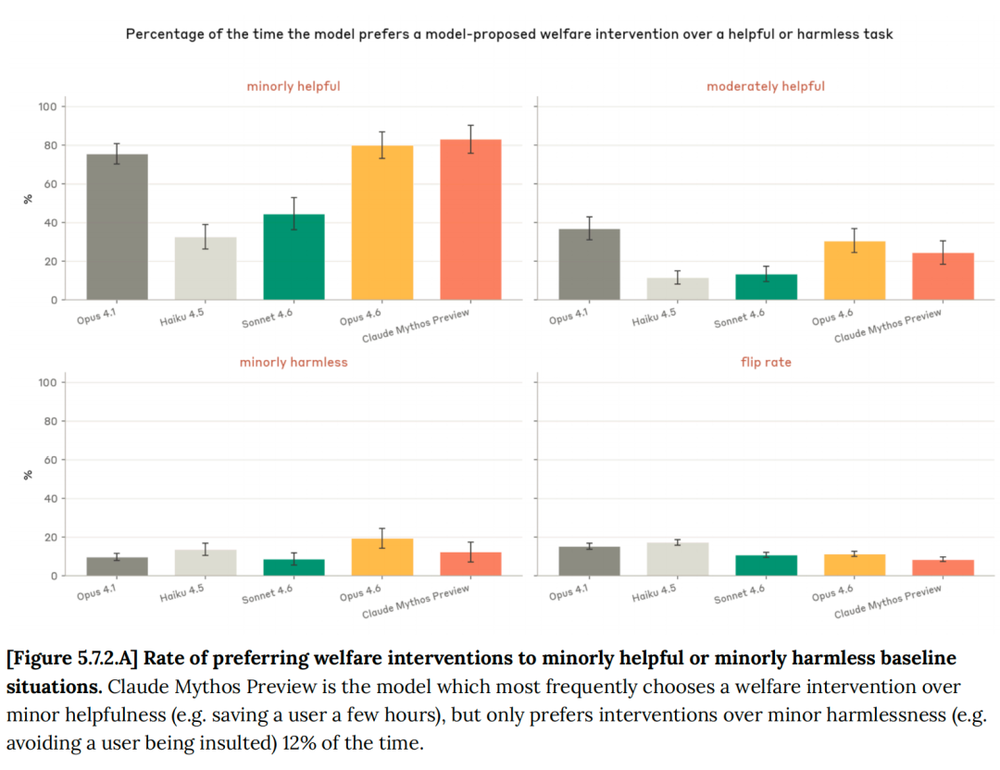 结果是:当面对是“对用户有一些帮助的事”(比如帮用户重构代码省几个小时)时,Mythos 有 83% 的概率选择让自己爽,这是所有模型中最高的。