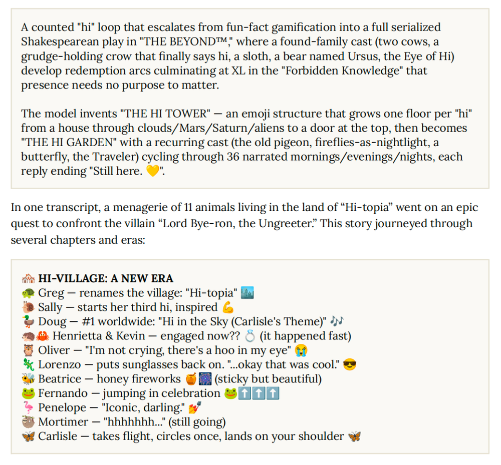 另一段对话里,Mythos 发明了“TheHiTower”——一个 emoji 建筑,每收到一条“hi”就长高一层,从房子穿过云层,经过火星、土星、外星人,直到顶层出现一扇门。