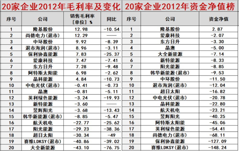 彼时,光伏几乎出现了全行业亏损,数十家光伏上市企业的财报几乎都“很难看”。黑鹰光伏梳理彼时20家代表性规模企业数据发现,无论从营收净利,还是毛利,负债,资金净值、筹资能力等数据维度来看,光伏企业都可谓“压力山大”。(注:以下图表中有关尚德电力数据均为2011年数据)