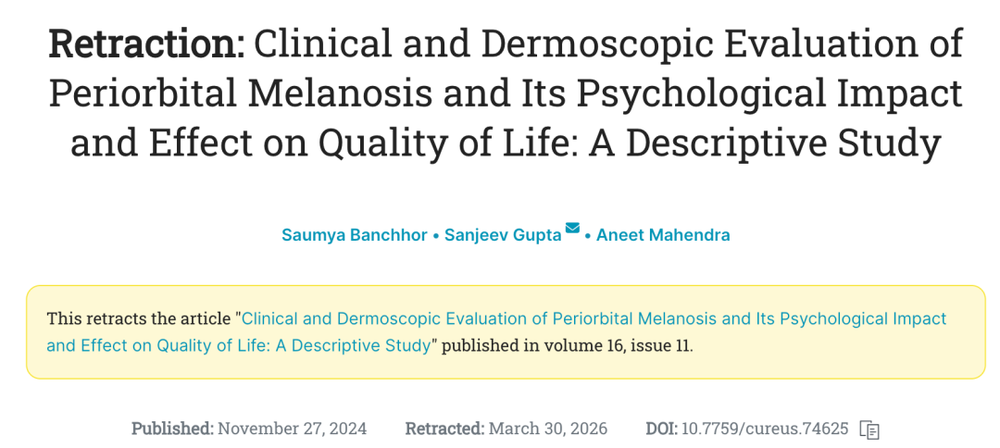 2024年,有印度研究人员在期刊Cureus上发表了一篇关于眼周色素沉着的论文。