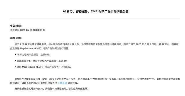 4月9日,腾讯云发布产品价格调整公告。从5月9日起,AI算力相关产品、容器服务TKE-原生节点、弹性MapReduce(EMR)三类产品的刊例价上调5%。距离3月11日腾讯云官宣Token调价相隔29天。
