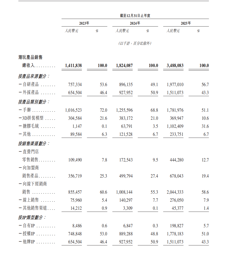 最新的招股书显示,2023年至2025年,TOP TOY收入分别为14.61亿元、19.09亿元和35.87亿元,复合增速超过50%;其在中国潮玩市场的份额为4.8%,位列第二。
