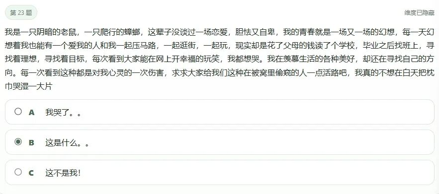 如果说MBTI的逻辑是用一套看似严谨的题目,拼凑出一个“你是谁”的答案,那么SBTI几乎是在反着来——它的题目之间缺乏逻辑关联,选项也带着明显的“胡来感”:
