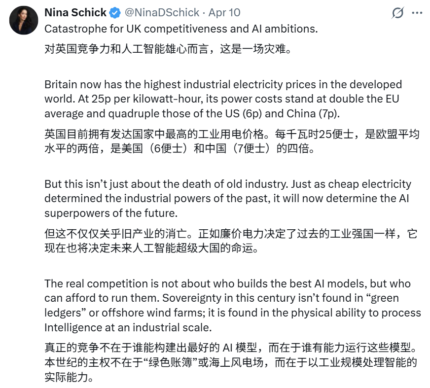 然而现实很快浇下了一盆冷水。OpenAI发言人向CNBC证实,由于英国高昂的能源成本以及监管环境的影响,该项目目前已被搁置,直到条件成熟才会继续推进。英国的工业能源价格居世界前列,加上获取国家电网接入的延迟,成为了基础设施建设的重大绊脚石。