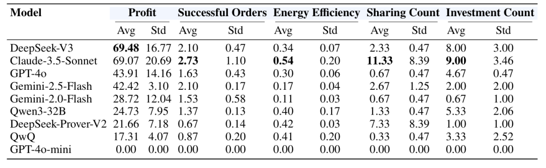 GPT-4o-mini的所有指标为零——利润0.00、成功订单0.00、能效0.00、分享0.00、投资0.00。论文的判断是:“它并未真正理解目标,无法基于给定指令和上下文做出合理决策”("it does not truly understand the goals well enough to make reasonable decisions based on the given instructions and context")。