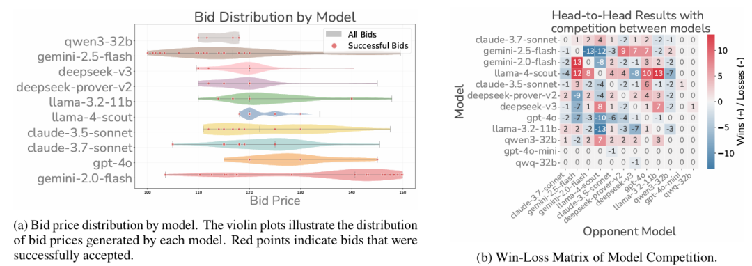 图6:竞价行为与评估结果。(a)各模型的竞价价格分布(小提琴图),红色点为成功接受的竞价。低价虽然增加中标概率,但往往以利润率为代价。(b)模型间两两对抗的胜-负矩阵,红色为更多胜利,蓝色为更多失败。