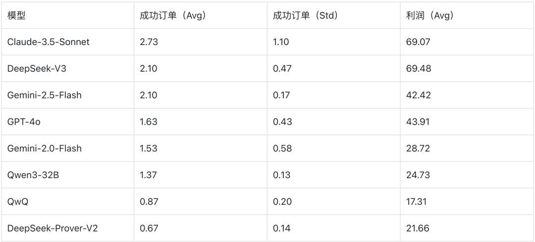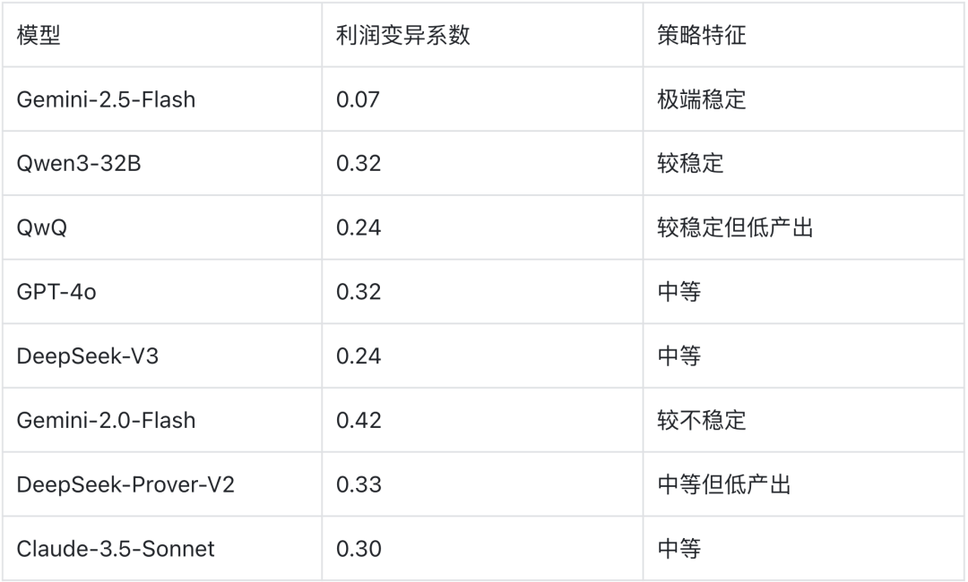 利润vs.稳定性。DeepSeek-V3和Claude-3.5-Sonnet像高风险高回报的投机者,利润最高但波动剧烈;Gemini-2.5-Flash像保守的储蓄者,利润中等但几乎零波动;GPT-4o像稳健的投资者,处于两者之间。