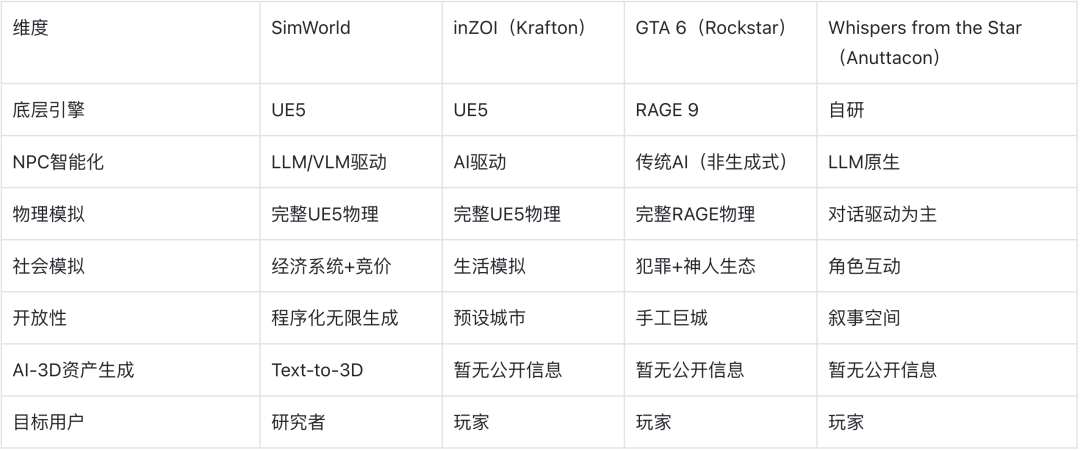 米哈游创始人蔡浩宇的新公司Anuttacon则走出了第三条路:《Whispers from the Star》以AI实时对话为核心玩法——玩家通过自然语言与AI角色Stella互动,引导她在太空生存场景中行动。这款游戏本质上是把SimWorld式的“LLM驱动智能体”概念直接做成了商业产品,只不过SimWorld里的受自然语言约束的配送员变成了幸存者。