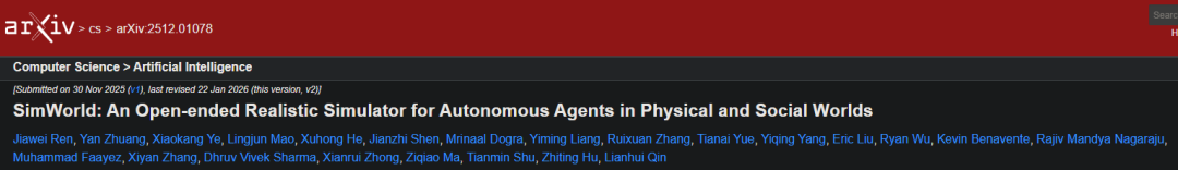 1.Ren,J.,Zhuang,Y.,Ye,X.,Mao,L.,He,X.,Shen,J.,Dogra,M.,Liang,Y.,Zhang,R.,Yue,T.,Yang,Y.,Liu,E.,Wu,R.,Benavente,K.,Nagaraju,R.M.,Faayez,M.,Zhang,X.,Sharma,D.V.,Zhong,X.,Ma,Z.,Shu,T.,Hu,Z.,&Qin,L.(2026).SimWorld:An Open-ended Realistic Simulator for Autonomous Agents in Physical and Social Worlds.arXiv:2512.01078v2.https://arxiv.org/abs/2512.01078