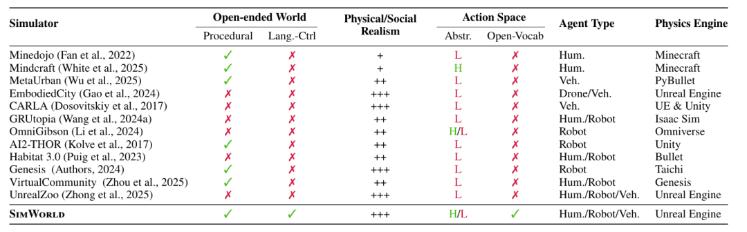 SimWorld同时满足真实(UE5物理引擎)、开放(程序化生成无限城市)、LLM原生(Gym-like接口+开放词汇动作空间)三个维度。