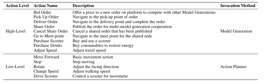 GPT-4o-mini接收到了规则说明、订单推送和地图信息,在字面意义上“理解”了每一个句子,却无法将这些句子组织成一个可执行的目标。原文可见研究团队清晰地定义了高层动作——竞标、取货订单、配送订单、共享订单、购买滑板车、购买饮料等——但GPT-4o-mini无法将这些动作按因果顺序编排成一串可执行的序列。
