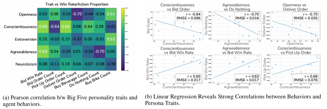 人格消融实验(Section 3.3)提供了策略一致性的另一个视角。论文使用表现最好的模型控制20个智能体,每个Big Five维度分配给2个智能体。Pearson相关矩阵显示人格设定确实塑造了行为——尽责性与竞价胜率正相关(r=0.65),宜人性与“什么都不做”强负相关,开放性与配送订单数负相关,开放性与购买滑板车正相关,外向性与购买饮料正相关。