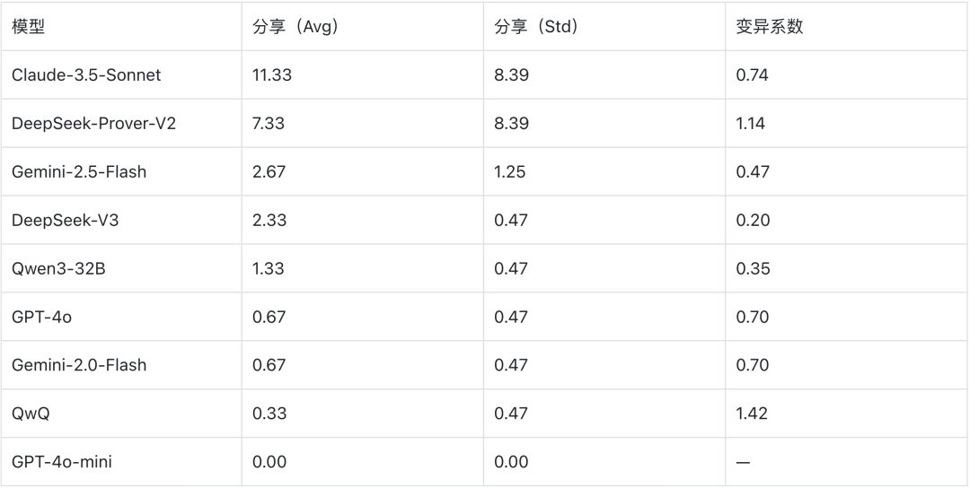 Claude-3.5-Sonnet平均分享最多,但也不稳定。DeepSeek-Prover-V2更极端——变异系数高达1.14。这意味着两个模型在合作行为上的“判断力”是可疑的。它们不是因为评估了合作是否有利而选择分享,而更可能是因为推理链的随机性在某些运行中经过了“分享”语义区域。