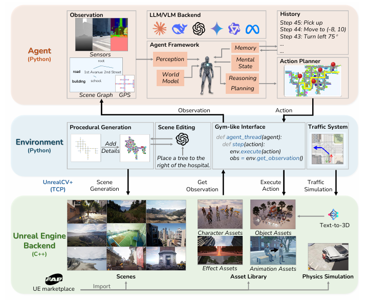 SimWorld采用三层架构(图2)如下。底层是虚幻引擎后端(C++),负责高保真渲染和物理模拟;中间是环境层(Python),提供程序化城市生成、交通系统和标准化的Gym-like接口;顶层是智能体层(Python),集成LLM/VLM推理引擎、观测空间和动作规划器。三层通过UnrealCV+通信模块(TCP协议)连接,形成完整的“感知-规划-行动”闭环。