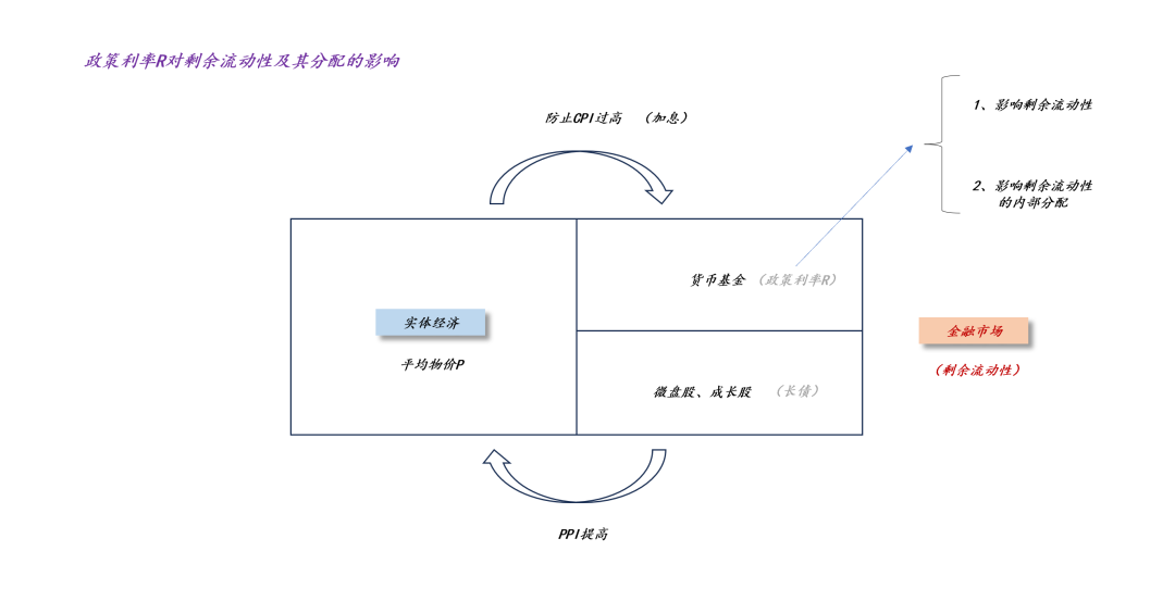如上图所示,显而易见,政策利率水平R决定了剩余流动性的分配状况,当R较高时,分配给股市的剩余流动性少;相反,当R较低时,分配给股市的流动性多。因此,在理论上,一定存在一个均衡政策利率水平R*,在R*之上,市场风格偏价值;在R*之下,市场风格偏成长。