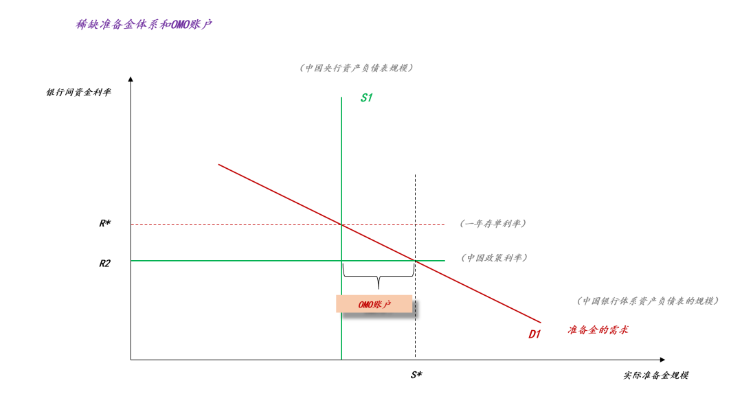 如上图所示,当前国内所采用的是稀缺准备金体系(ps:跟美国的“充裕准备金体系”形成对偶)。那么,这个稀缺体现在哪里呢??在政策利率水平上(ps:一般是7天OMO利率,即1.40%),准备金的需求是大于准备金的供给的(ps:“稀缺”二字的落脚点),于是,“稀缺准备金体系”要求央行用OMO账户来填补缺口。那么,S1和D1的交点R*又代表了什么呢??代表了中长期资金的供需状况,在一般状况下,我们可以用一年存单利率来代理。