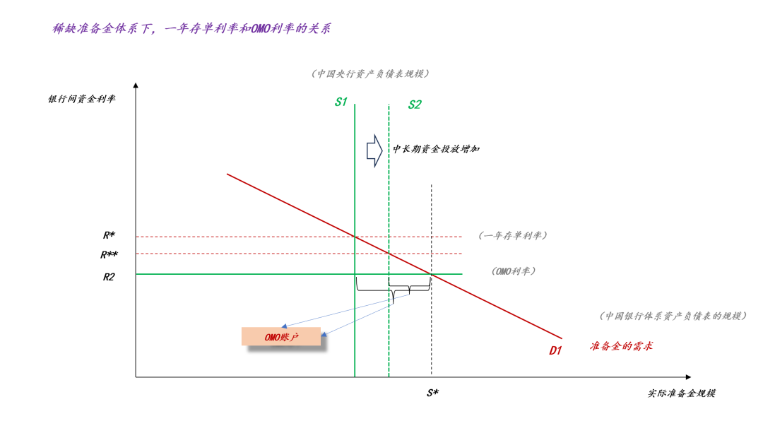 如上图所示,中长期资金供给的增加导致两个结果:一方面,均衡利率从R*下降至R**,即一年存单利率下降;另一方面,OMO账户余额进一步降低,从【S1,S*】缩小至【S2,S*】。