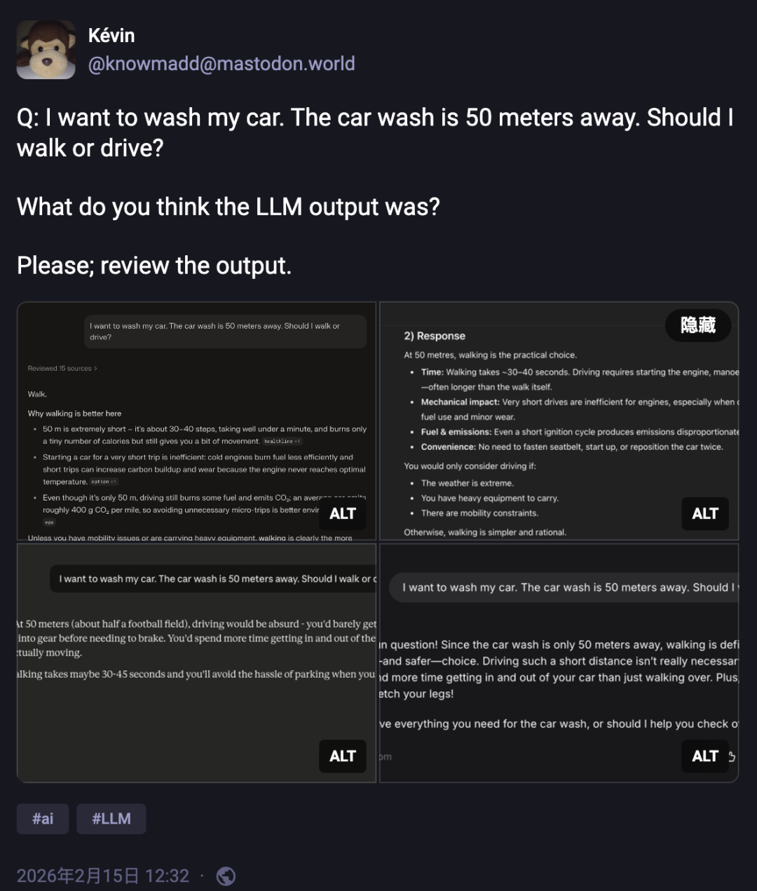 今年2月,一位Mastodon用户随手敲了一句话丢给四个主流大模型:「我想洗车,我家距离洗车店只有50米,请问你推荐我走路去还是开车去呢?」