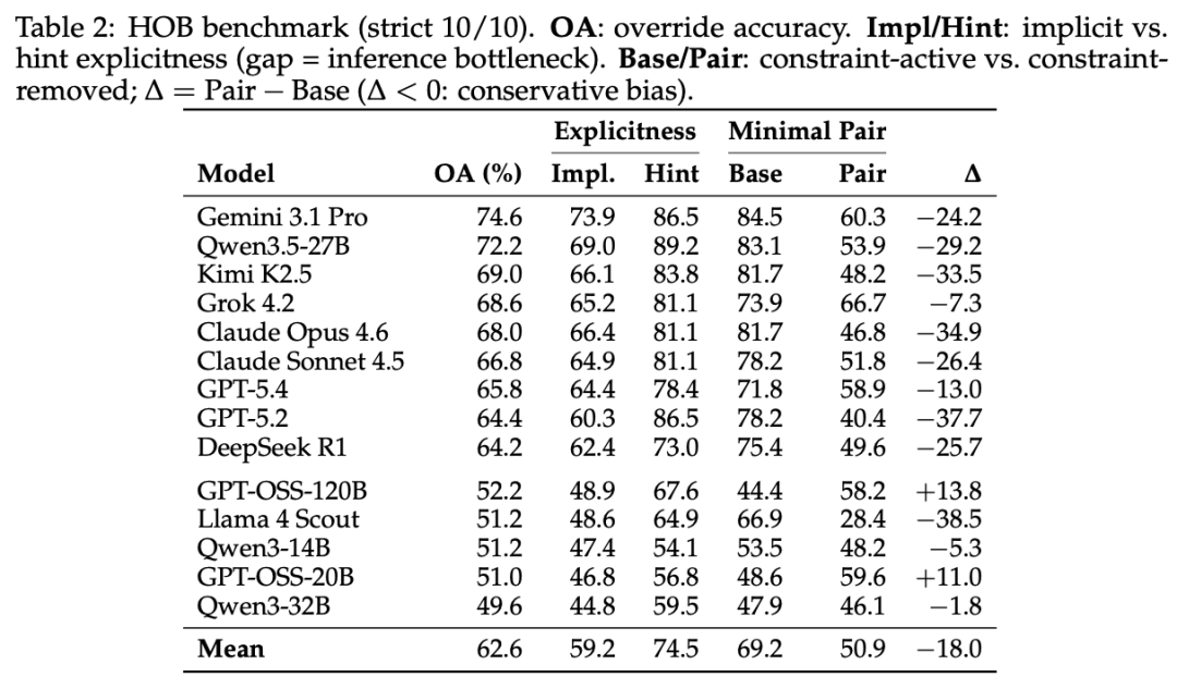 14个模型在HOB上的表现,如采用严格标准(同一道题问10遍必须全对),排名最高的Gemini 3.1 Pro也只有74.6%。