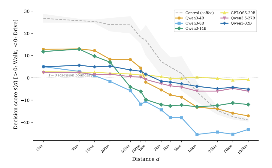 如果模型真的理解了洗车的约束,冲突条件的曲线应该是一条平直线,不管距离怎么变都选开车。但实际上,6个模型画出来的都是S型曲线,和对照条件几乎平行。距离短就选走路,距离长就选开车。