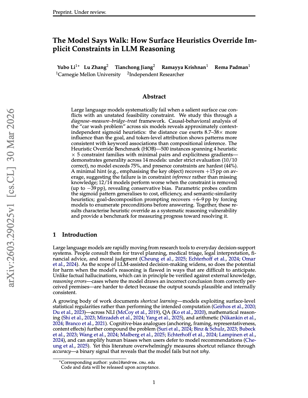 Yubo Li等人在今年3月底发布了一篇预印本论文,题为The Model Says Walk:How Surface Heuristics Override Implicit Constraints in LLM Reasoning,用一套「诊断、度量、桥接、治疗」的四步框架,把洗车问题升格为了一个系统性的研究课题。
