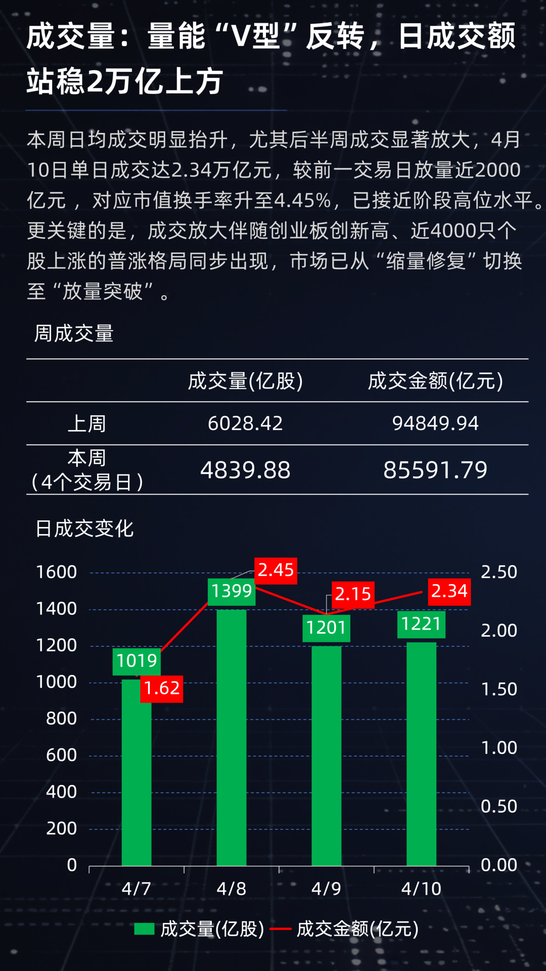 成交量成为本周市场最重要的信号之一。数据显示,本周A股日均成交额显著抬升,尤其后半周放量明显。4月10日单日成交额达到2.34万亿元,较前一交易日增加近2000亿元。
