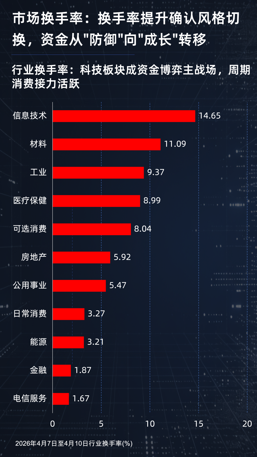 行业换手率结构进一步验证风格切换。科技板块成为资金博弈主战场,资金活跃度显著高于其他板块;周期与消费板块则呈现接力特征,资金轮动加快。