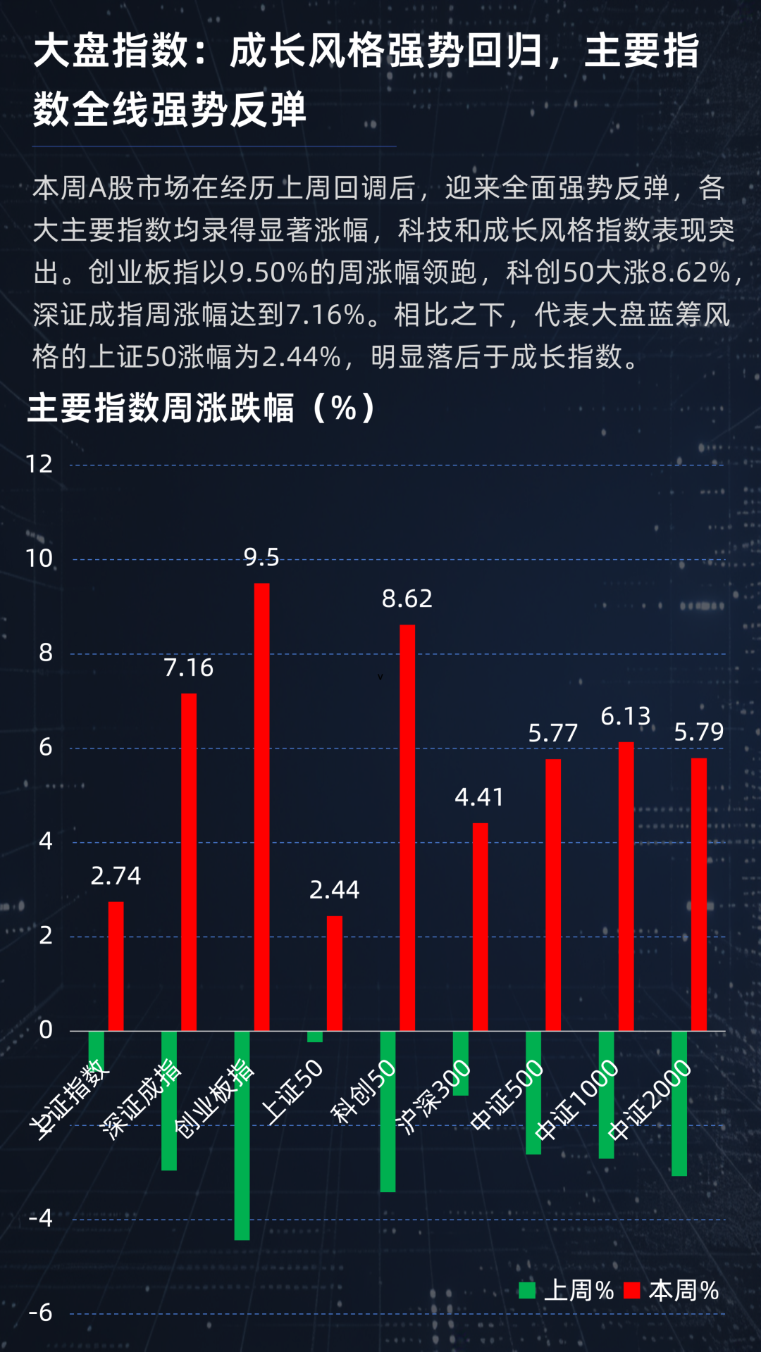 本周A股主要指数全线反弹,呈现出明显的“成长占优”特征。其中,创业板指以9.50%的周涨幅领跑市场,科创50指数上涨8.62%,深证成指上涨7.16%,而上证50仅上涨2.44%,相对落后。