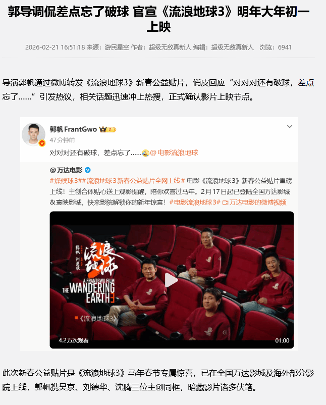 然后是更长远的问题,今天不是2019和2023了,在视频AI开始冲击影视行业的当下,很多人不再看好电影这个文化产品,觉得早晚会被淘汰。所以破球观众和科幻电影爱好者们难免担心,不光是郭帆之后可能再无郭帆,甚至球3也会随着电影业的消亡成为中国科幻电影的绝唱。