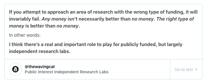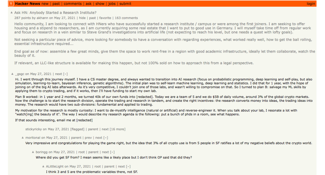 更新#6:这个Hacker News的讨论帖值得一读:《Ask HN:有人创办过研究机构吗?》(Ask HN:Anybody Started a Research Institute?)