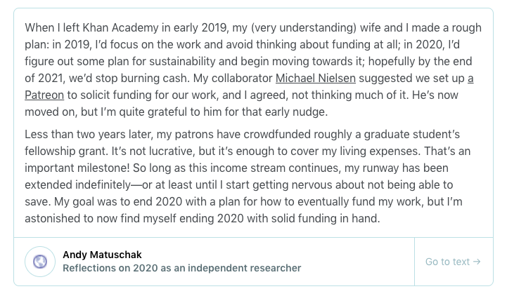 “2019年初我离开可汗学院(Khan Academy)时,我和(非常理解我的)妻子制定了一个粗略的计划:2019年,我专心研究工作,完全不考虑资金问题;2020年,我会想出一个可持续的方案并开始朝这个方向努力;希望到2021年底,我们能够停止消耗积蓄。我的合作者迈克尔·尼尔森(Michael Nielsen)建议我们设立一个Patreon账号来为研究工作筹集资金,我同意了,当时也没太当回事。他现在已经离开了,但我非常感激他当初的推动。
