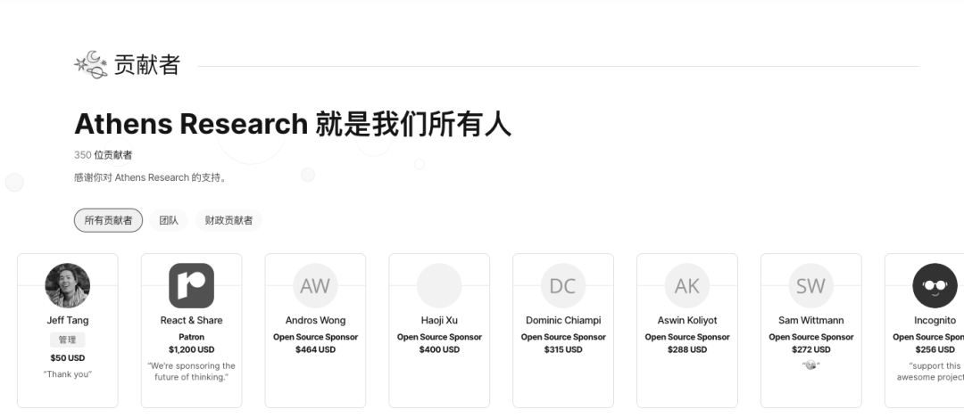 更新#2:对于通过众筹运作的组织而言,或许一个更有趣、更具参考价值的模型不是Are.na,而是Athens Research,它已经建立了一套完整的社区资助模式……