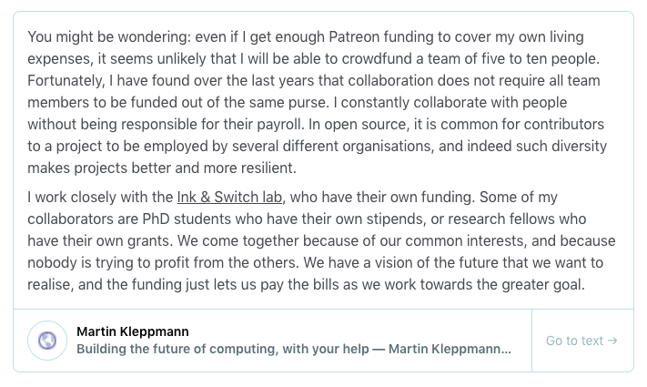 “你可能会想:即便我能获得足够的Patreon资助来覆盖个人的生活开支,通过众筹来供养一个五到十人的团队似乎也不太现实。幸运的是,过去几年的经验让我发现,协作并不要求所有团队成员都由同一个“钱袋子”支付薪酬。我经常与他人合作,却无需负责他们的工资单。在开源领域,一个项目的贡献者们受雇于多个不同的机构是常态,事实上,这种多样性反而让项目变得更优秀、更具韧性。