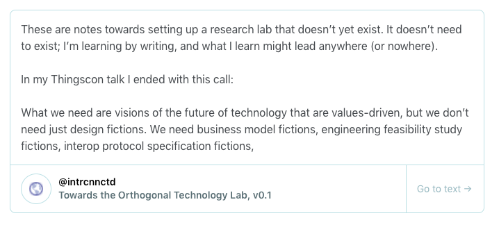 我们所需要的,是那些由价值观驱动的未来技术愿景,但我们需要的不仅仅是设计“虚构”。我们需要商业模式虚构、工程可行性研究虚构、互操作协议规范虚构……”