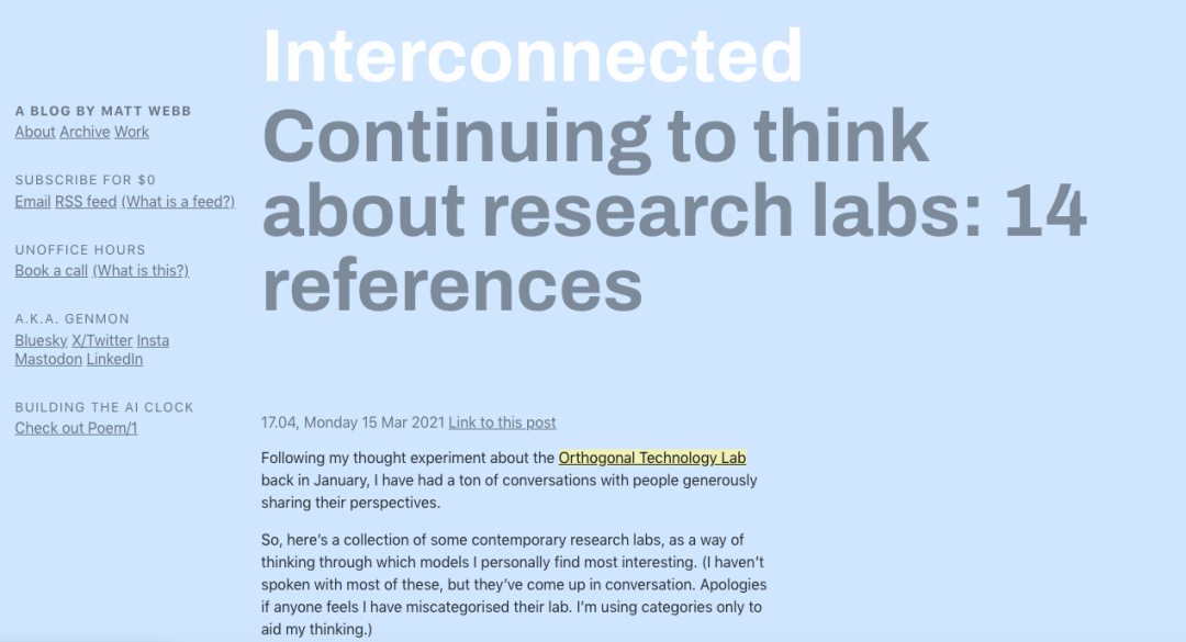 更新#4:马特(Matt)在博客中分享了一些灵感,并整理了他正在关注的14个研究工作室: