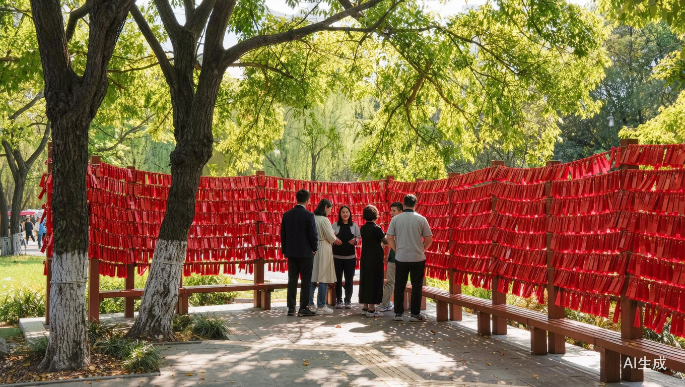 红纸条上的文字终将被雨水打湿或随风飘散,但文字背后所承载的集体焦虑与生存策略,却将在可见的未来持续占据公园的这一隅,继续其作为固态现代性堡垒的坚守。
