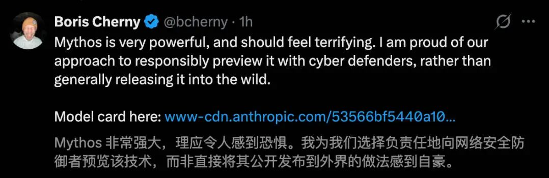 2026年4月8日,全球 AI 行业迎来了一个标志性时刻:Anthropic 发布其最新模型Claude Mythos。在各大主流 AI 基准测试中,这个模型交出了一份极为强势的成绩单:无论是复杂编程任务、多步逻辑推理,还是模拟人类高级职业考试,它的表现都明显压过了 GPT-5.4 与 Gemini 3.1 Pro。CC 之父 Boris Cherny 甚至给出了一句很有分量的评价:“Mythos 非常强大,会让人感到恐惧”。