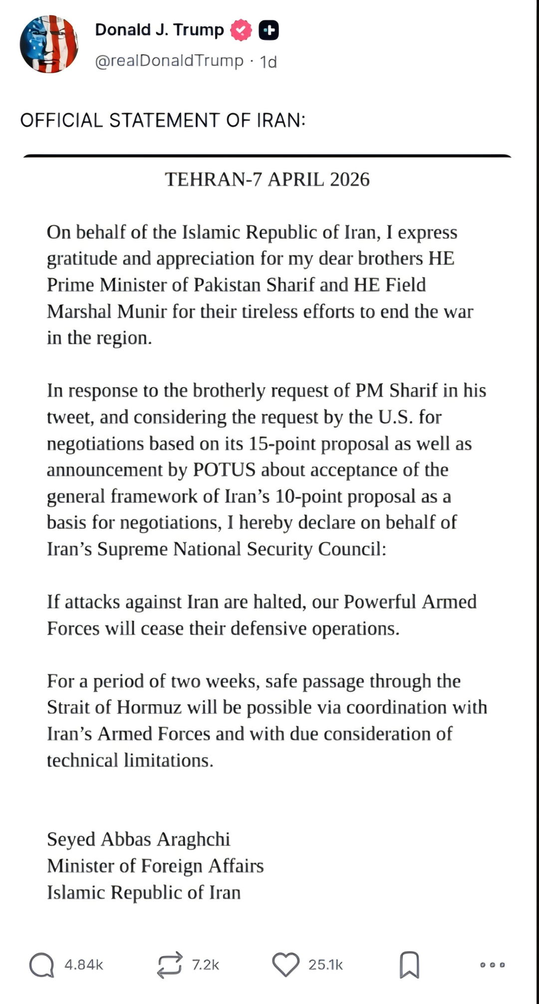 不过悬念没有维持多久,由于伊朗方面抢先公布了“伊十条”,在新闻舆论占据上风。美国——尤其是特朗普本人也不得不出来回应。先是特朗普发推特宣称,伊朗公布的10条跟巴基斯坦和美国媒体报道出来的10条不一样,跟伊朗方面4月8日公布出来的10条也不同。特朗普宣称伊朗给了美国一个新的秘密版本,那个版本跟美方要求伊朗投降的“美国15条”很像。他还指责伊朗外长“英语不好”,说伊朗的10条是“拿ChatGPT写的”——不知道伊朗人现在有没有违反制裁去美国公司那里花费Token。