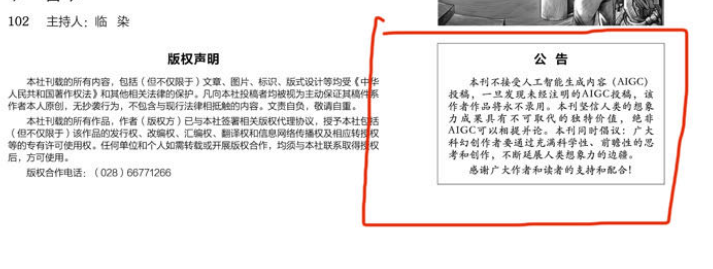 今年,老牌科幻杂志《科幻世界》发布公告:“不接受人工智能生成内容投稿,一旦发现,永不录用。”